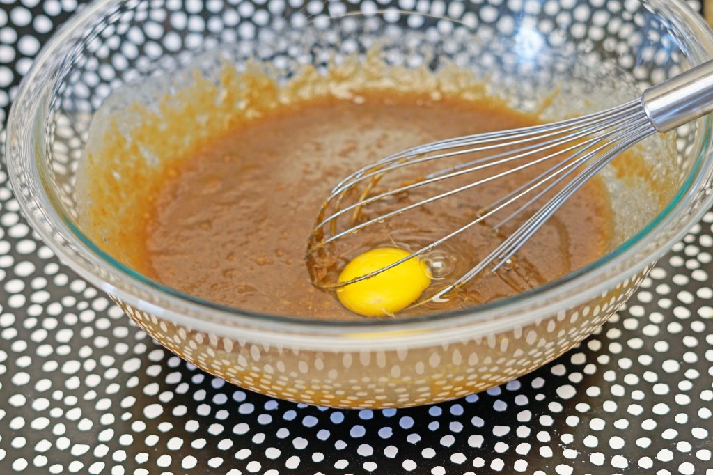 Next, I mixed the eggs into the butter and sugar batter. You can see the batter with the melted butter continued to remain dark and heavy. The softened butter mixture began to lighten and gain volume.