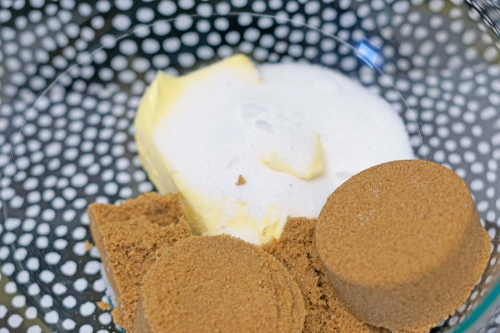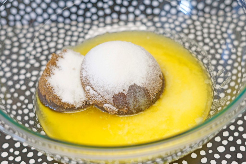 - In a large bowl, mix together the butter, brown sugar and granulated sugar and whisk until combined.