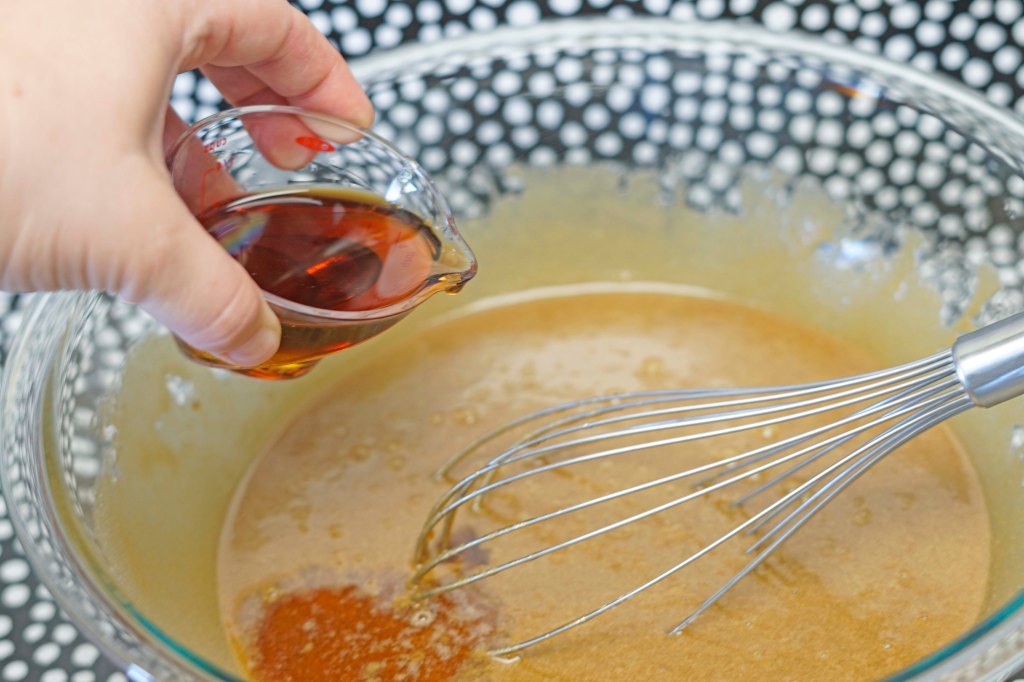 - Whisk in both eggs. Add vanilla and maple syrup and whisk.