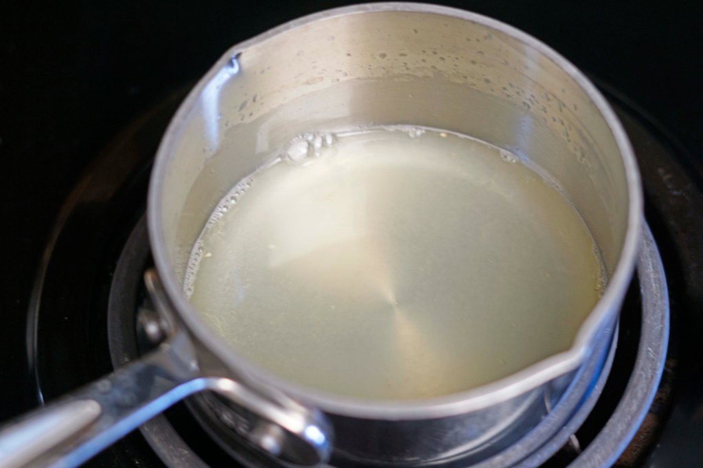 While the cake is baking, put the sugar and lemon juice into a small pan. Whisk it over medium heat until the mixture is clear and the sugar is all dissolved. Then set the mixture aside until the cake is finished baking.
