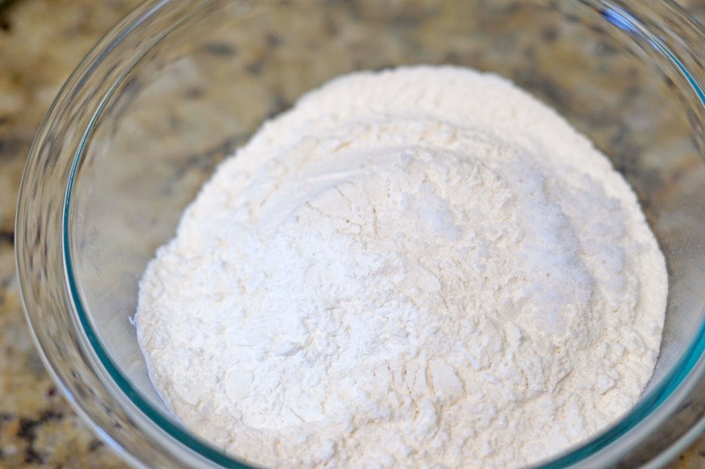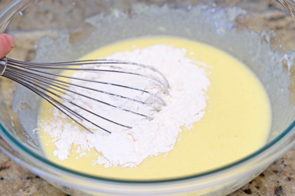- In a small bowl whisk together the dry ingredients, flour, baking powder and kosher salt. Then slowly whisk the dry ingredients into the wet batter until combined, but do not over mix.