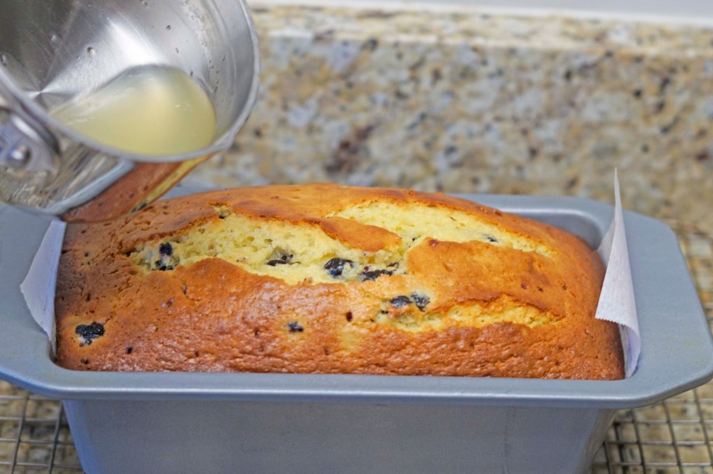 When the cake is finished baking, pull it out of the oven and put it on a cooling rack. Then poke the whole top of the cake with a toothpick and slowly pour a 1/3 of the lemon juice and sugar mixture over the top of the cake. Once it is all absorbed add the next 1/3 and continue until all of the syrup is absorbed into the cake. Allow the cake to cool completely in the pan.