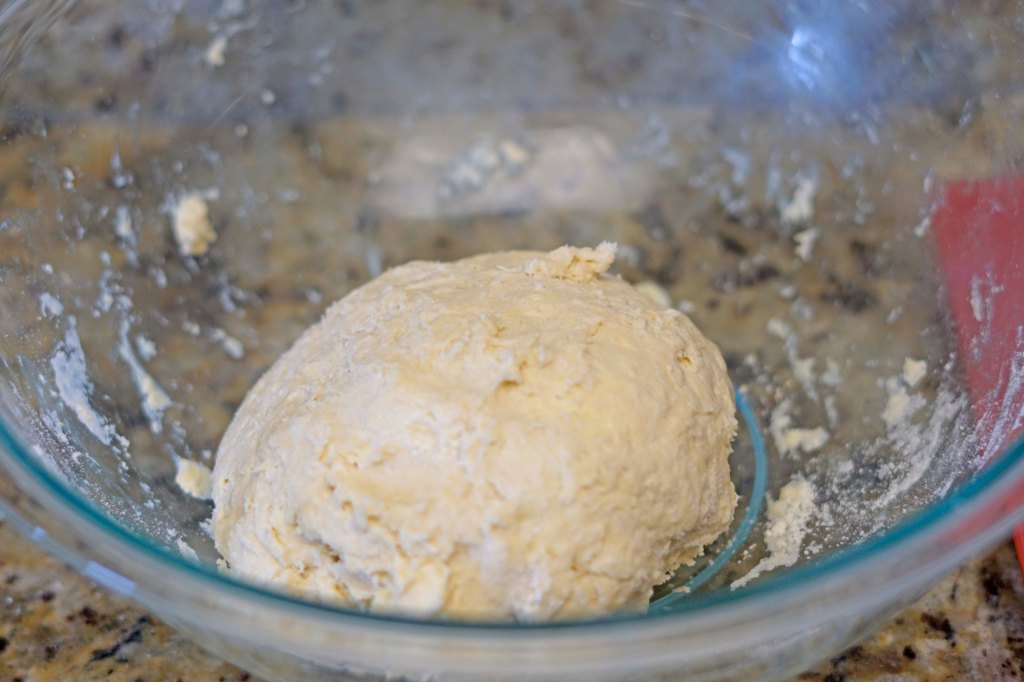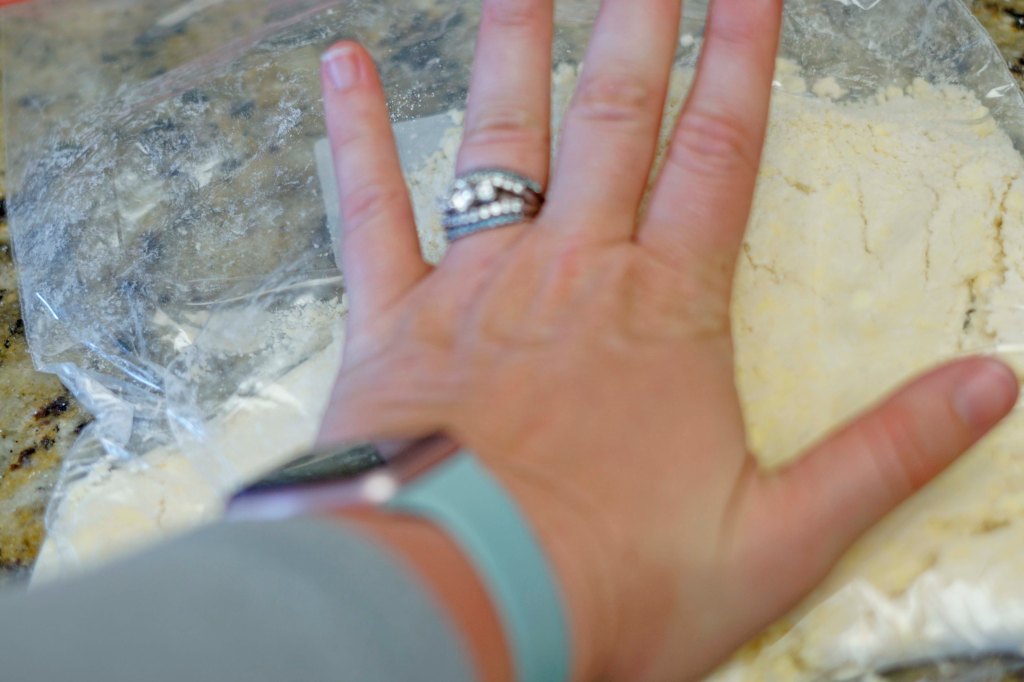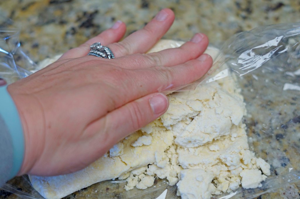 My buddy helped me to add a little water at a time to the mixture. I used my hands to gently work the water into the dry ingredients until I could pick it up without crumbling or falling apart. In all honesty, the idea of dumping all the rest of the water in became too tempting to my buddy and our dough ended up a little moister than I would have preferred. I added a little extra flour to the outside of the dough before wrapping it in plastic wrap to put in the fridge to chill for 30 minutes. The recipe says that you can roll it right away or chill it. While it was chilling I preheated the oven to 400 F degrees.