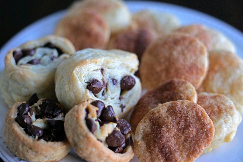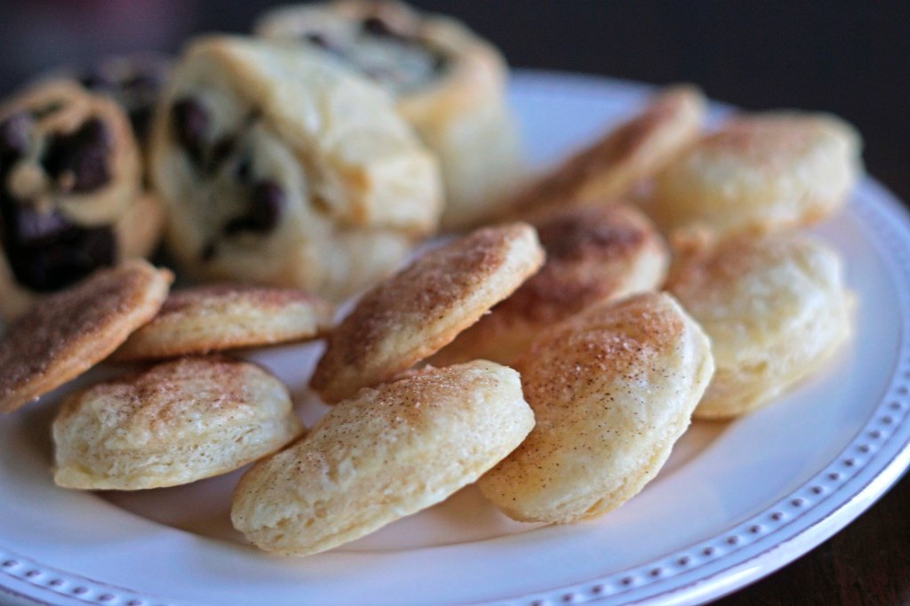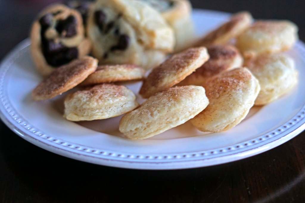I baked the cinnamon sugar cookies for 8-10 minutes until the dough was puffy and slightly browned. I baked the chocolate rolls for about 15-18 minutes until the dough was puffy and slightly browned.
