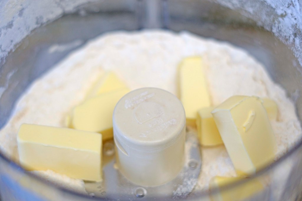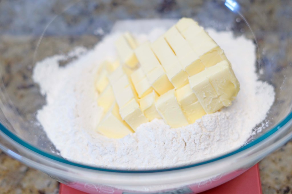 - Dice the butter into small cubes and add to the flour mixture. Coat all the butter in flour. Work the butter into the flour with a pastry cutter, 2 knives or your hands. There should be larger than pea sized pieces of butter visible.