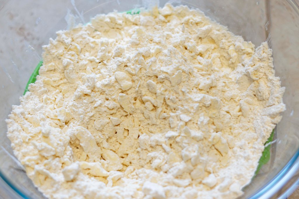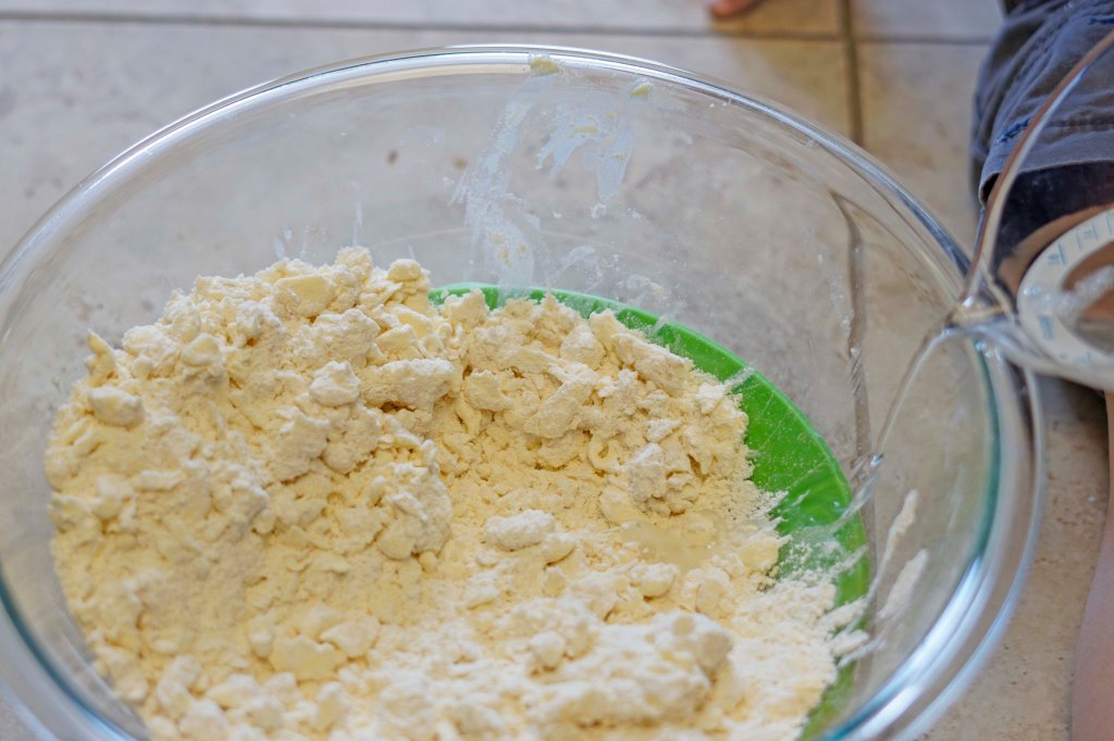 Next, my baking buddy put his blocks aside for a moment to help me cut the putter into the flour with a pastry cutter. You could also do this with 2 knives or your hands as well. The recipe said that larger than pea sized pieces of butter should be visible in the flour.