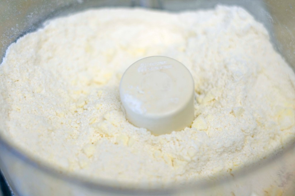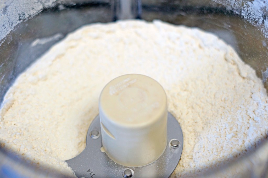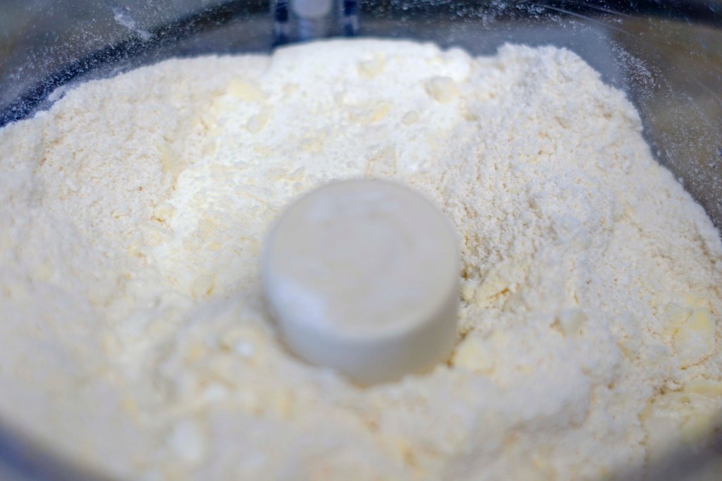 - In the bowl of a food processor add the cold dry ingredients and the cold cream cheese and process for 20 seconds. Add the frozen butter and pulse about 10 times until the butter is the size of peas. Add the heavy cream and vinegar and pulse until combined about 5 pulses.