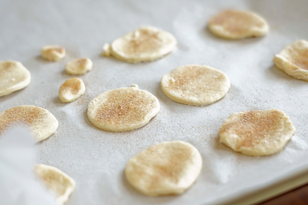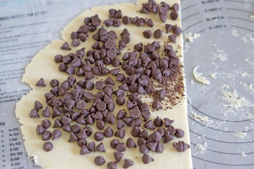 After the dough chilled, I put it on my dough mat (I should have added a little flour to the bottom of the mat & on top) and then I covered the dough with parchment paper and rolled it out nice and thin. Then I used a round cutter to cut circles out of half the dough and put them on a parchment paper lined baking sheet and sprinkled cinnamon sugar on top of them. The second half of the dough I covered in chocolate chips and rolled it like a jelly roll and sliced it. I put these on a separate baking sheet with parchment paper because I knew these would take longer to bake.
