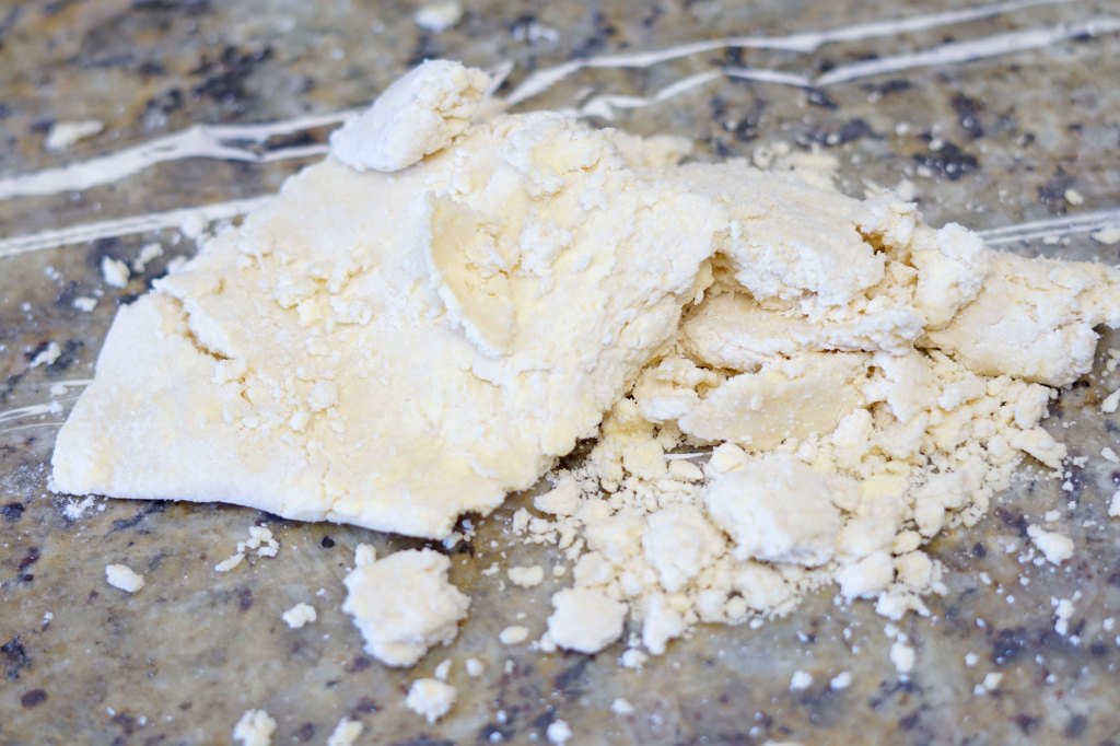 - Drizzle the ice water into the dough and work with your hands to gather the mixture together until it can be picked up with your hand and not crumble. Keep adding water until your reach this stage.