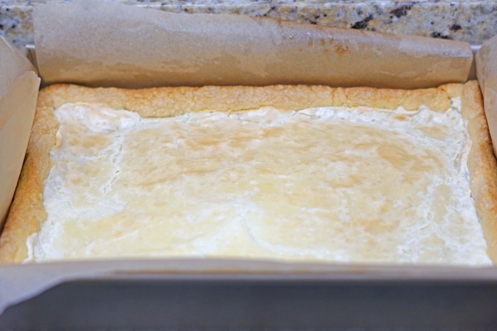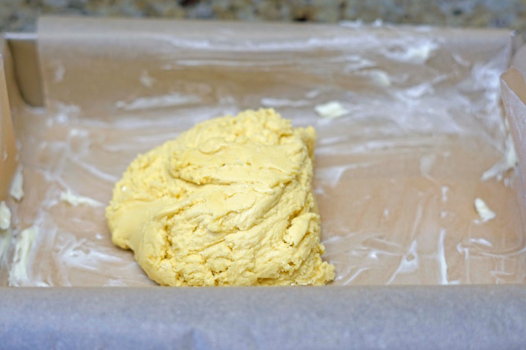 - Mix the cake mix, butter and beaten egg together and press into the pan and slightly up the sides.