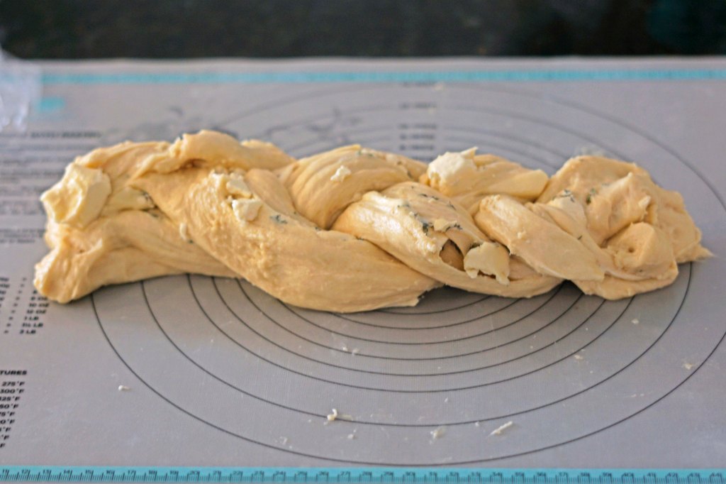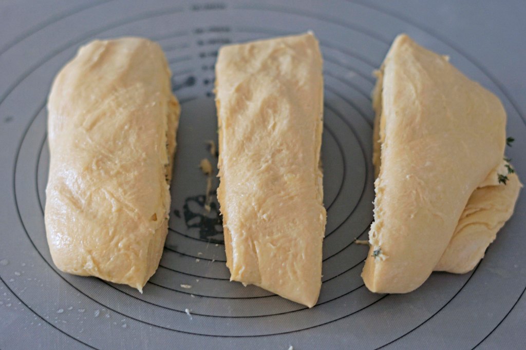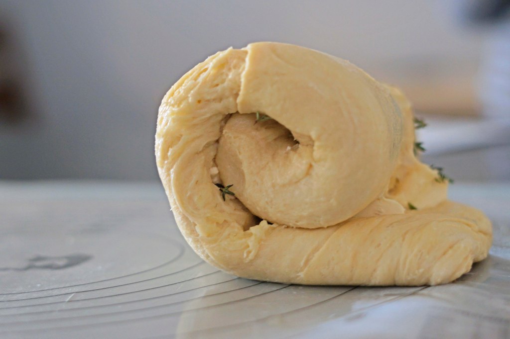 - After the dough has doubled in size in the fridge, pull the bowl out an let it warm up on the counter. Spray oil on a dough mat and dump the dough out and flatten it. Add the cheese and thyme to the dough. Roll it from one end to the other and then flatten it out. Roll it again and then flatten. Divide the dough into three parts and roll and stretch it out into three ropes.