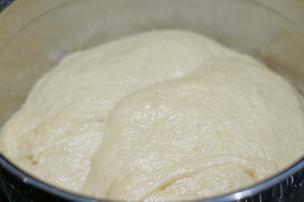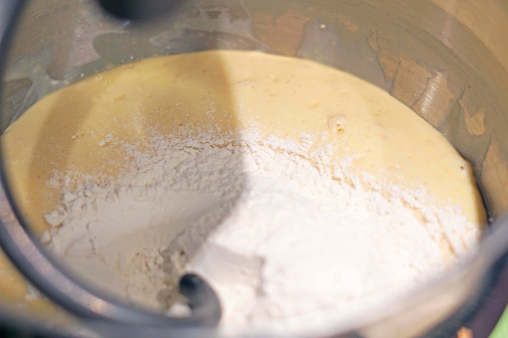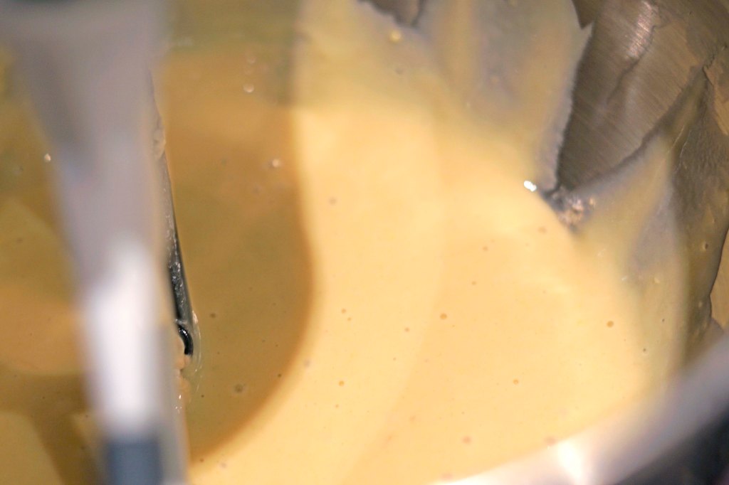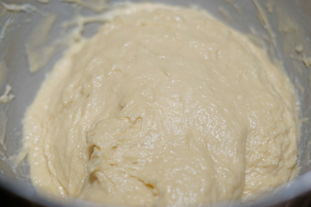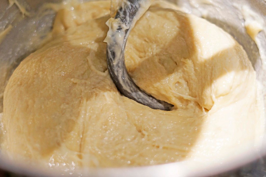 To begin this recipe, I added 3 tablespoons of sugar and 1 tablespoon of instant dry yeast to the bowl of my stand mixer while I heated 1/3 cup of whole milk to 100 F degrees. I added the milk to the bowl and used the paddle attachment to mix everything gently together. I left the mixture to begin to get foamy. This makes sure that the yeast is active and still alive. Then I added 1 1/2 cups of bread flour and 5 room temperature large eggs to the bowl of the stand mixer. I beat it all together on medium-low speed for about 2-3 minutes or until it was very smooth. Then I removed the paddle attachment and covered the bowl with plastic wrap and let it stand for 30 – 45 minutes until it begins to bubble.