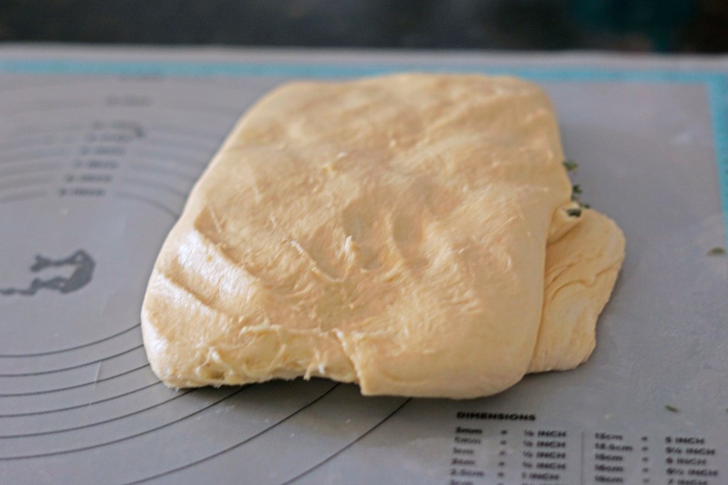 On Friday morning, I pulled the dough out of the fridge, where it had doubled in size again, I let it warm up a little bit on the counter and then dumped it onto my dough mat that I sprayed with grapeseed oil. I flattened it out with my hands and added a wedge of Saint Andre triple-cream cow’s milk cheese that I cut the skin off of and chopped into chunks. Then I added 2 tablespoons of fresh thyme on top (I already had thyme in the fridge so I decided to use it instead of rosemary as the recipe originally stated). Next, I rolled the dough up to fold in the cheese and thyme. I flattened it out, then rolled it and flattened it again.