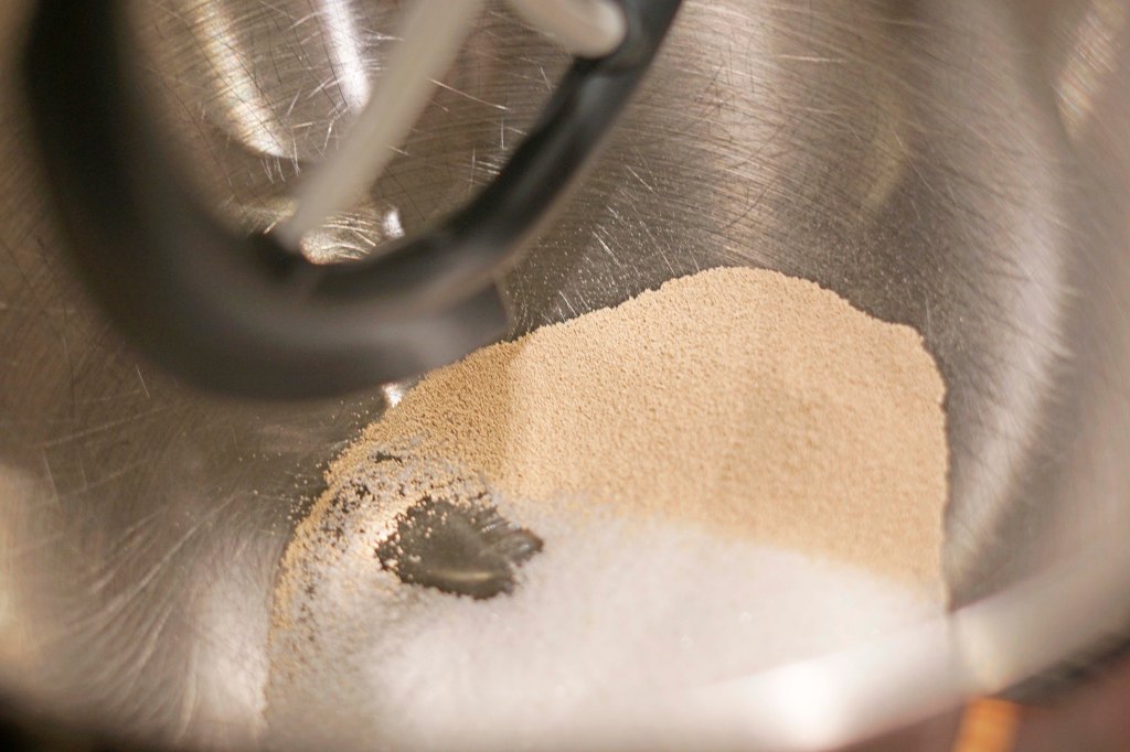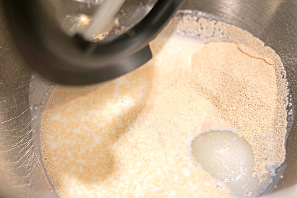 - In the bowl of the stand mixer fitted with the paddle attachment, add the sugar, yeast, and warmed milk. Mix and let stand until foamy, about 10 minutes.