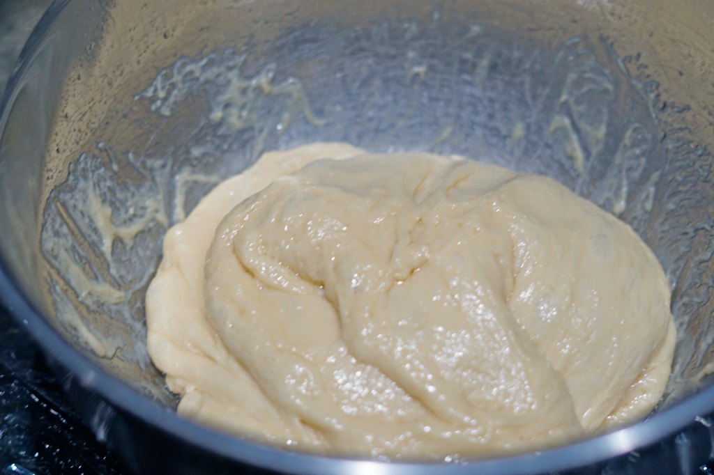 - While the mixer is still on medium, begin adding the butter 1 tablespoon at a time. It will be a slow process and you may need to stop and scrape the butter back to the middle of the dough hook. Do not add the next bit of butter until the first is mixed in. The dough will be soft and silky when finished.