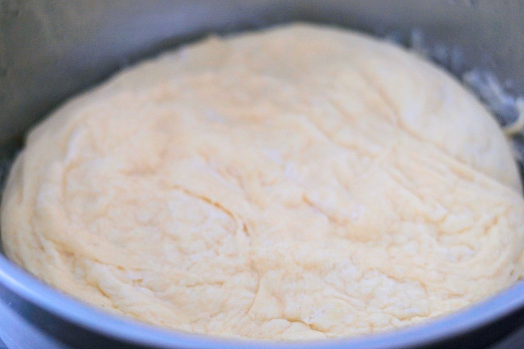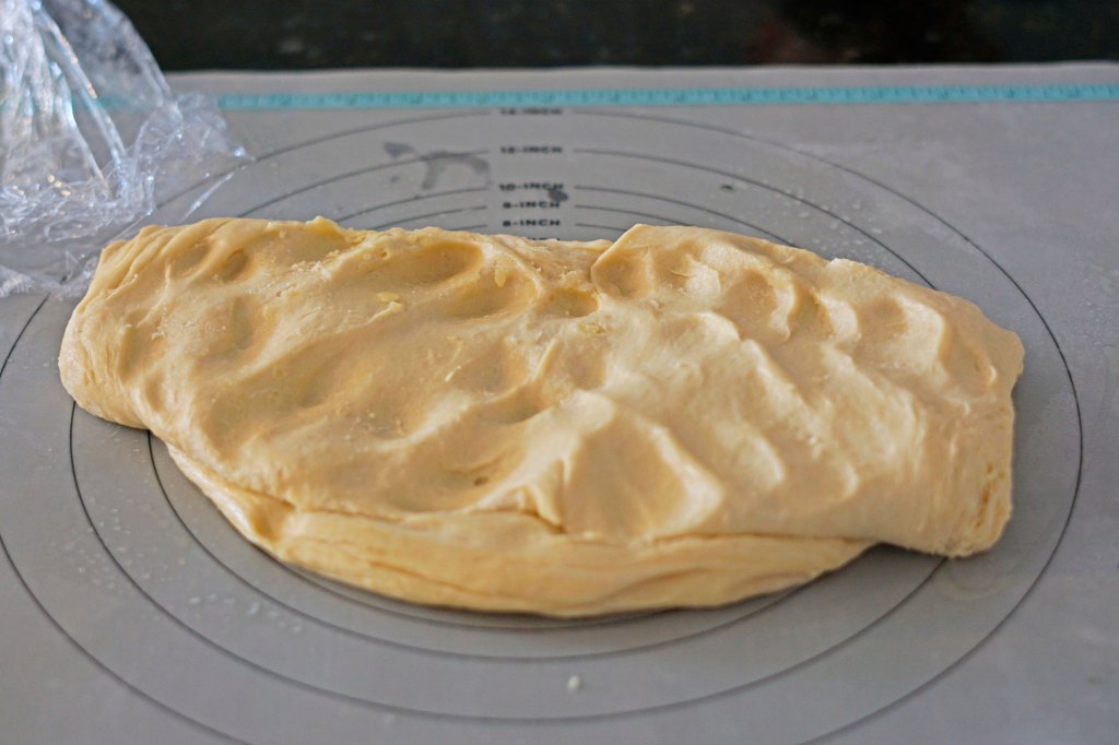Once all the butter is added, the finished dough is scraped out of the mixing bowl and added to a large bowl that has been sprayed with a neutral oil (I used grapeseed oil). I covered it and put it in my oven on the proof setting to rise for 45 minutes, which helped it to double in size. If you do not have a proof setting, you can let it rise in a warm place until it doubles in size – usually 1 1/2 to 2 1/2 hours. After it has doubled in size, I punched the dough down a few times and then folded the dough over to knead it in the bowl a few times. I re-covered the bowl again and placed it in the fridge overnight to let it rise again slowly and develop flavor.