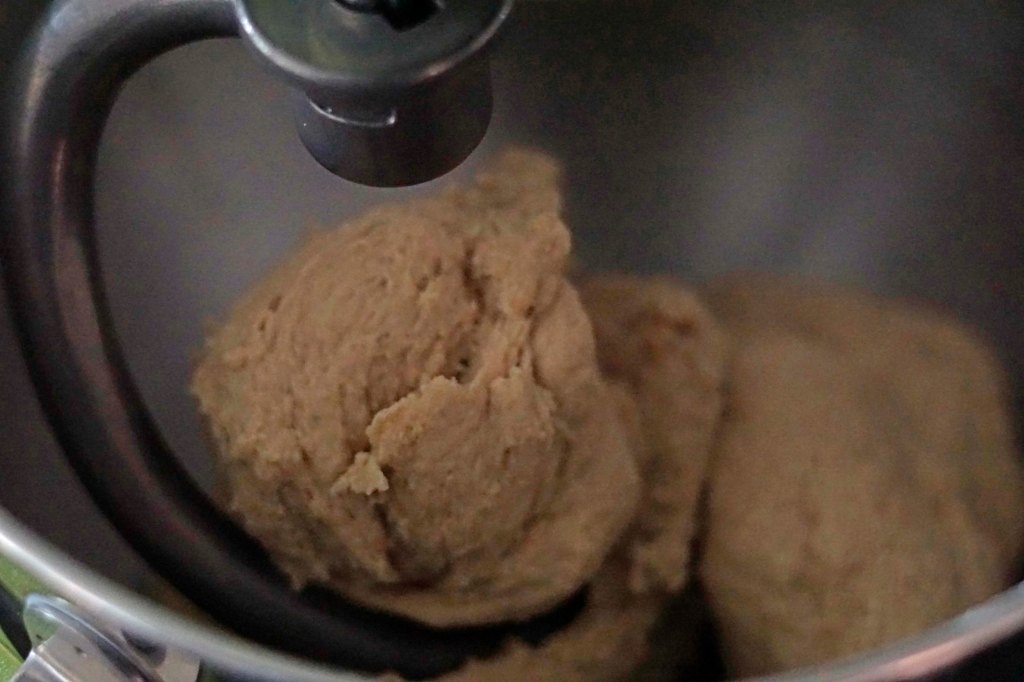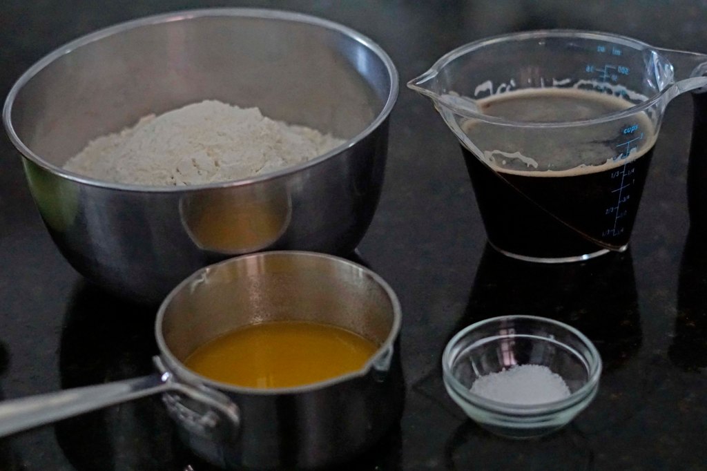 The first step for these pretzels is to put 1/2 cup of warm (100 – 110 F degree) water into the bowl of a stand mixer with 2 tablespoons of brown sugar and 2 1/4 teaspoons of active dry yeast. I whisked these together for a moment and then let them sit for about 5 minutes to make sure that the yeast had a chance to bloom. Then I added 4 1/2 cups (Spooned & leveled) bread flour, 1/2 cup of melted butter, 1 1/2 teaspoons of kosher salt and 1 cup of beer.