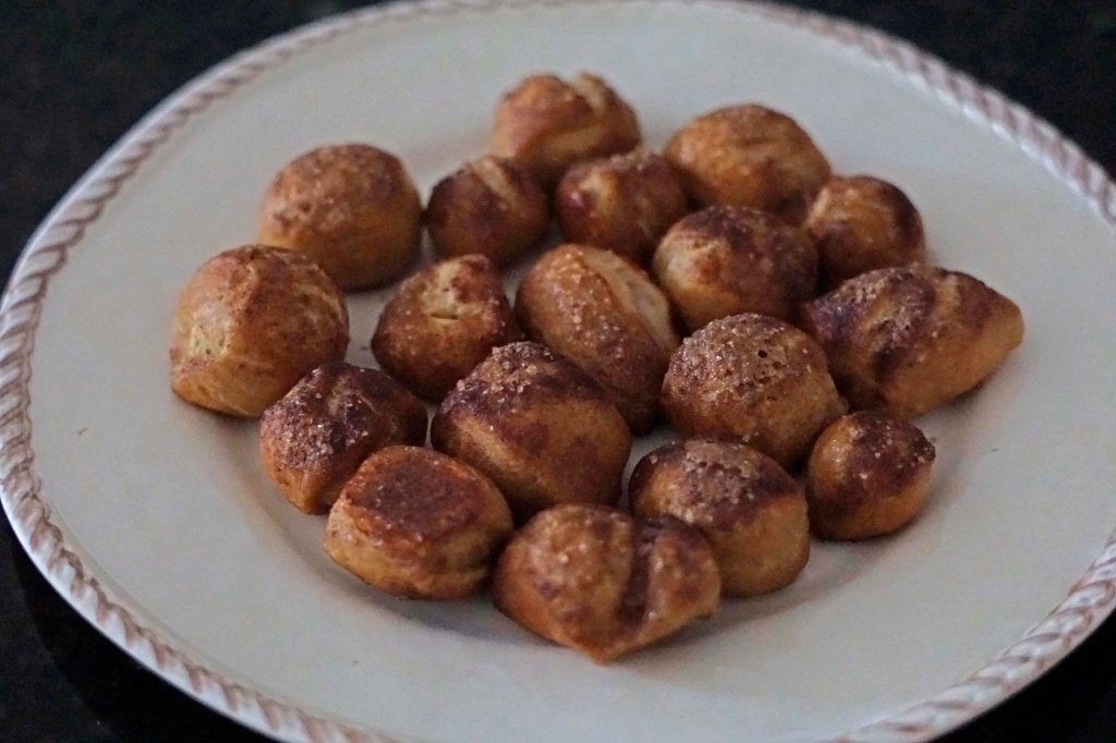 I preheated the oven to 425 F degrees. While it was preheating, I put a large pot of water to a boil and then added a 1/4 cup of baking soda to the water. Next, I dropped each pretzel into the water for 15 seconds, flipped it and let it cook for another 15 seconds. I lifted the pretzel out with a spider and let the water drain off and placed it on a parchment lined baking sheet. I immediately sprinkled salt on the top of the pretzels or cinnamon sugar on the nuggets.
