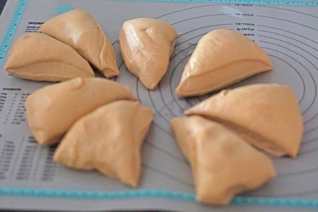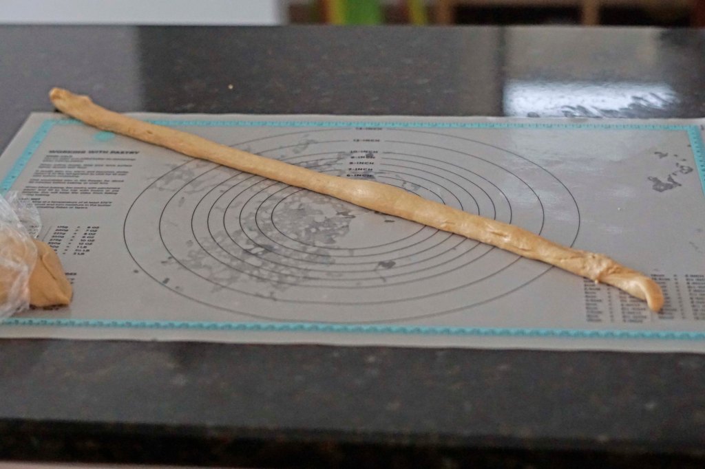- After rising, dump onto an oiled dough mat and divide into 8 equal pieces. Roll each piece into a long rope and then pick up the ends and cross them twice. Pick the ends up again and bring them to the base and attach them to bottom.