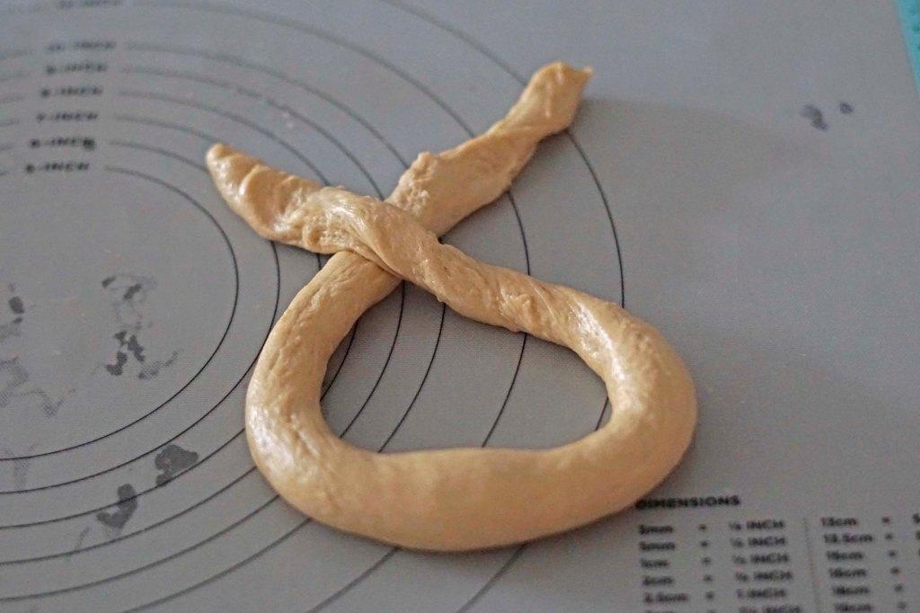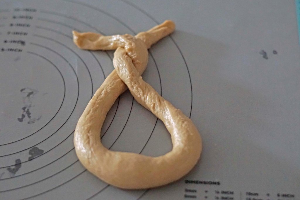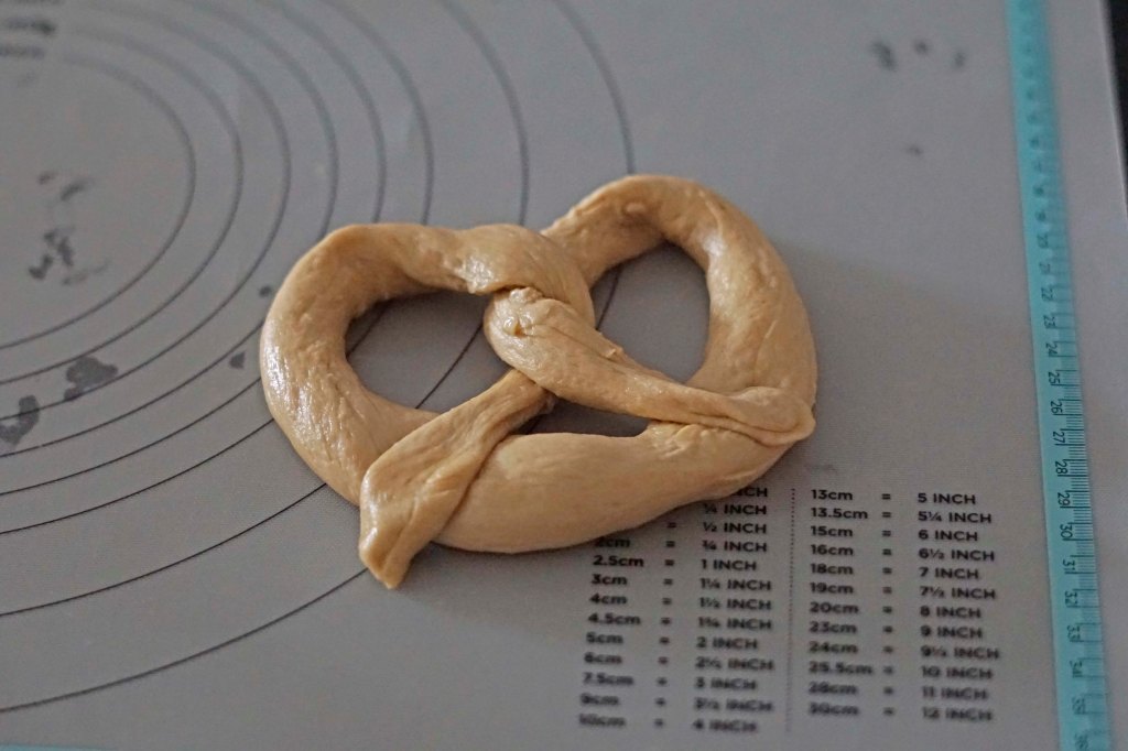 Next, I turned the dough out onto my oiled dough mat and divided the dough into 8 equal portions. I used my hands to roll out the dough into a long rope. Think back to your favorite play-doh moments here! While rolling it out, I periodically picked up the ends and stretched it out a little as well to help the dough get longer. Then I picked up the ends, crossed one over the other, then crossed them over again. I picked up the ends and brought them down to the bottom and attached them to the base of the pretzel. I did pick up the pretzel from the top loops and stretch it out a little to make sure that the holes were as large as possible.
