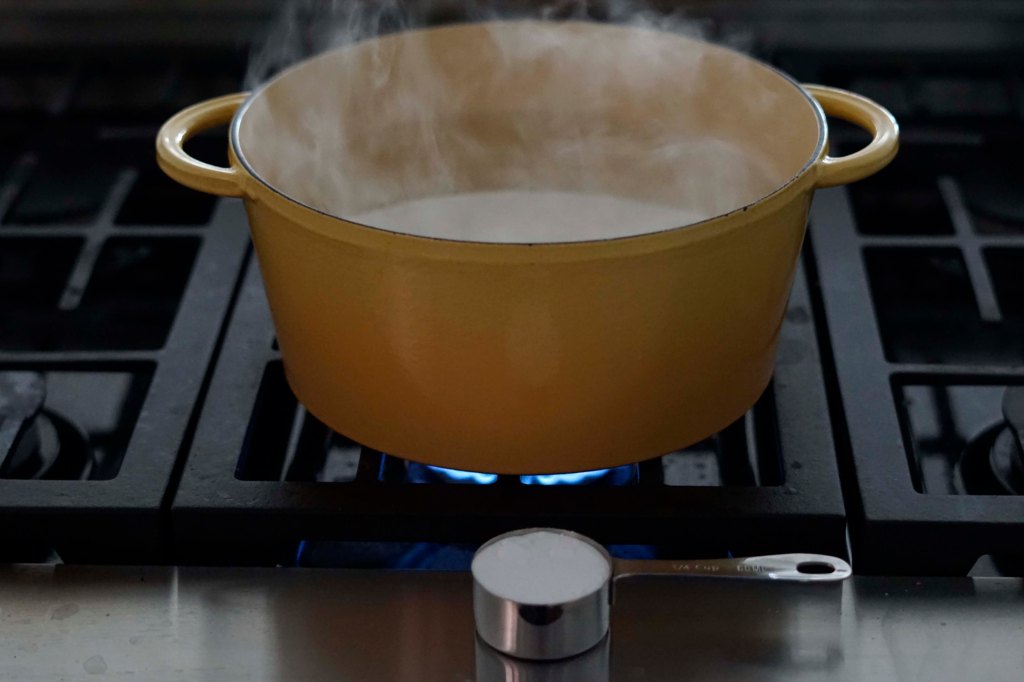 - Preheat the oven to 425 F degrees. Heat a pot of water to a boil and add 1/4 cup of baking soda. Drop each pretzel into the water for 15 seconds, flip it and then remove it with a slotted spoon or a spider to let the extra water drip off. Transfer it to a baking sheet lined with parchment paper and immediately sprinkle with flaky salt or cinnamon sugar.