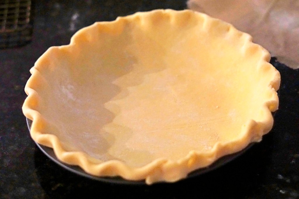 - Dust the dough with flour and roll the dough out as thin as possible. Transfer to the pie pan and trim the extras. Fold the crust under and crimp the crust. Wrap the crust in plastic wrap and freeze for 10 minutes.