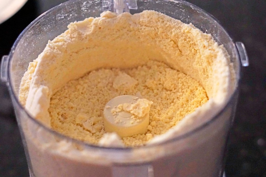 In the base of my food processor I placed 2 1/4 cups all purpose flour. Then I added 2 tablespoons of sugar and 1/2 teaspoon of kosher salt. I let the machine pulse several times to mix the dry ingredients. Then I added 1 cup of cubed frozen butter to the machine and pulses several times until the butter was the size of peas. Then while the machine pulsed, I added 1/4 cup of ice water and 2 tablespoons of vodka to the dough. As you can see, when everything is mixed it, the dough will not be a cohesive dough yet.