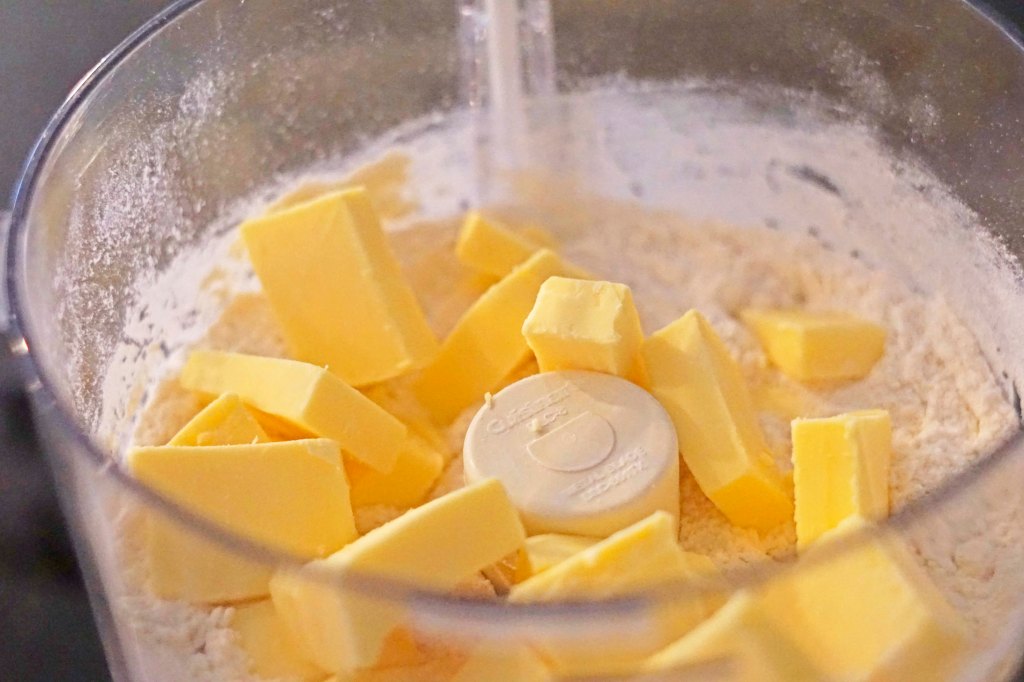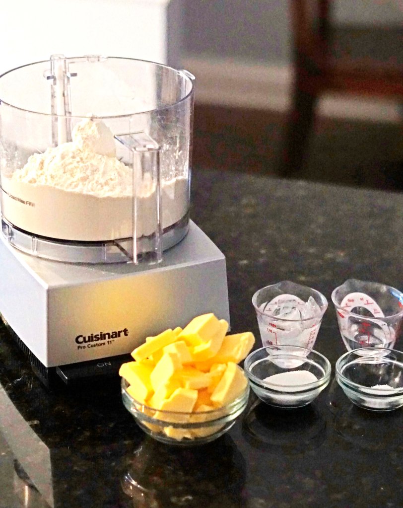- In a food processor combine the flour, sugar and salt. Pulse to combine. Add the frozen butter and pulse until the butter is the size of peas. Add the water and vodka while the food processor is pulsing and everything is combined.