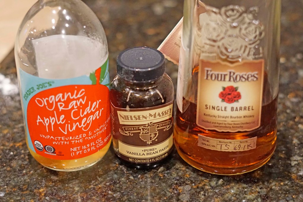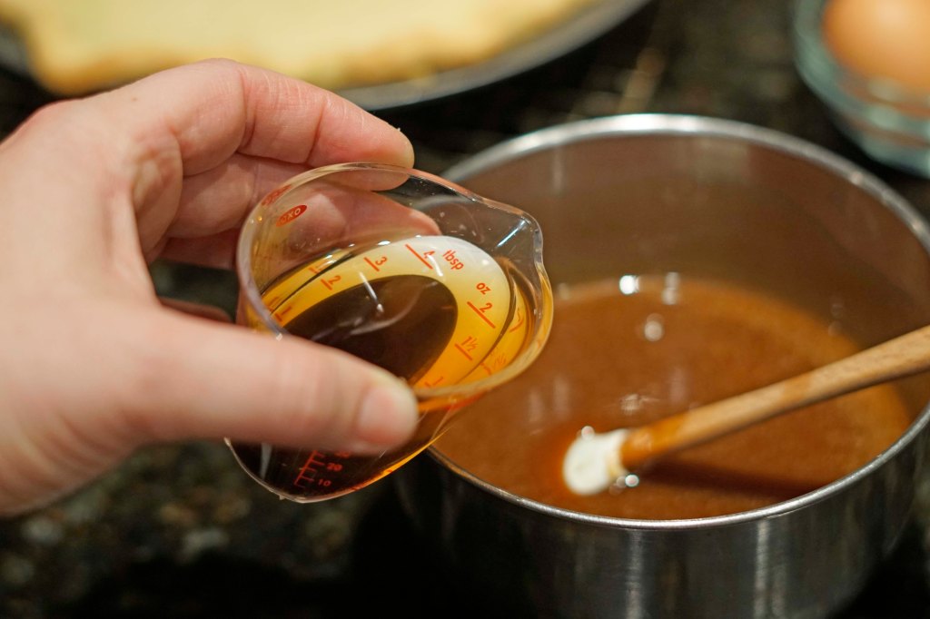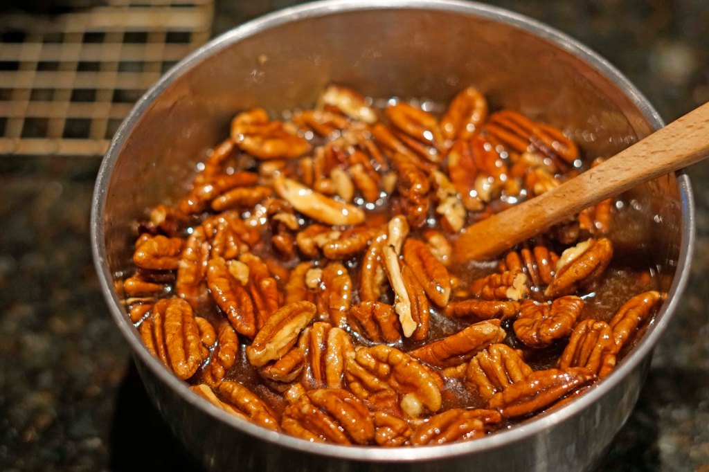 After the 1 minute, I pulled the mixture from the heat and poured it into another bowl to help it begin cooling down. After 2 or 3 minutes, I added 1 teaspoon of apple cider vinegar, 2 teaspoons of vanilla bean paste (because I was out of vanilla), and 2 tablespoons of bourbon to the mixture and mixed in well. Then I added the toasted pecans to the mixture as well.
