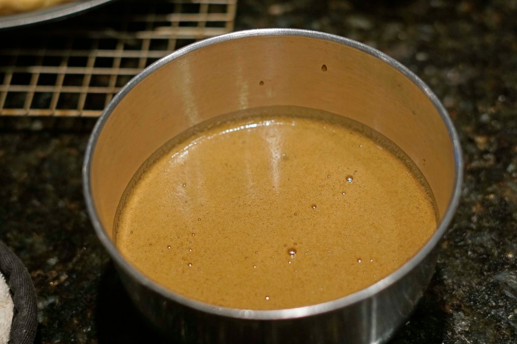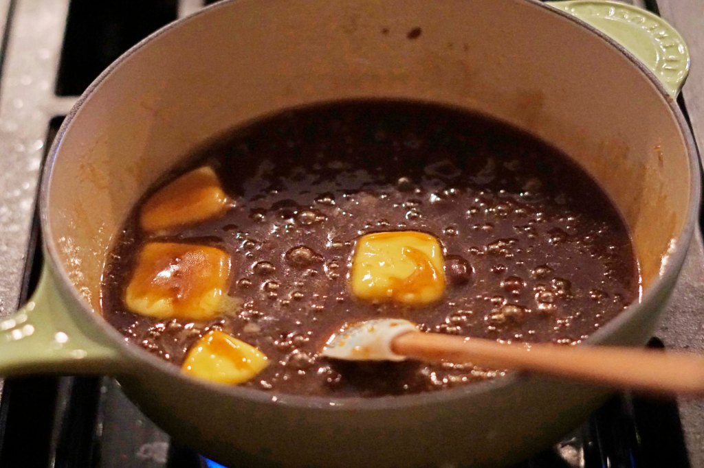 In a heavy bottomed sauce pan, I placed 1 cup of packed dark brown sugar, 6 tablespoons of butter, 3/4 cup of golden syrup and a small pinch of kosher salt. I heated this over medium heat until everything melted and came together, then I let it simmer and bubble for 1 minute.