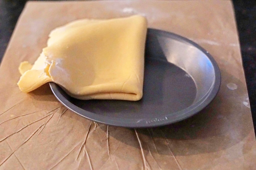 After the dough has a chance to rest, preheat the oven to 425 F degrees. Then pull the dough from the fridge, remove the plastic wrap and place it on a piece of parchment paper sprinkled with flour. Sprinkle the dough with a little more flour and top it with another piece of parchment paper and roll it as thin as possible between the two sheets. To transfer the dough, make sure it has a thin layer of flour on it and fold it into quarters. Then place that on the pie pan and unfold the dough. Gently pick up the edges of the dough and let gravity pull the dough down into the pie pan. You want to try to avoid stretching the dough at this stage, to try to keep it from shrinking later. Then trim the extra dough from the edge of the pie pan.