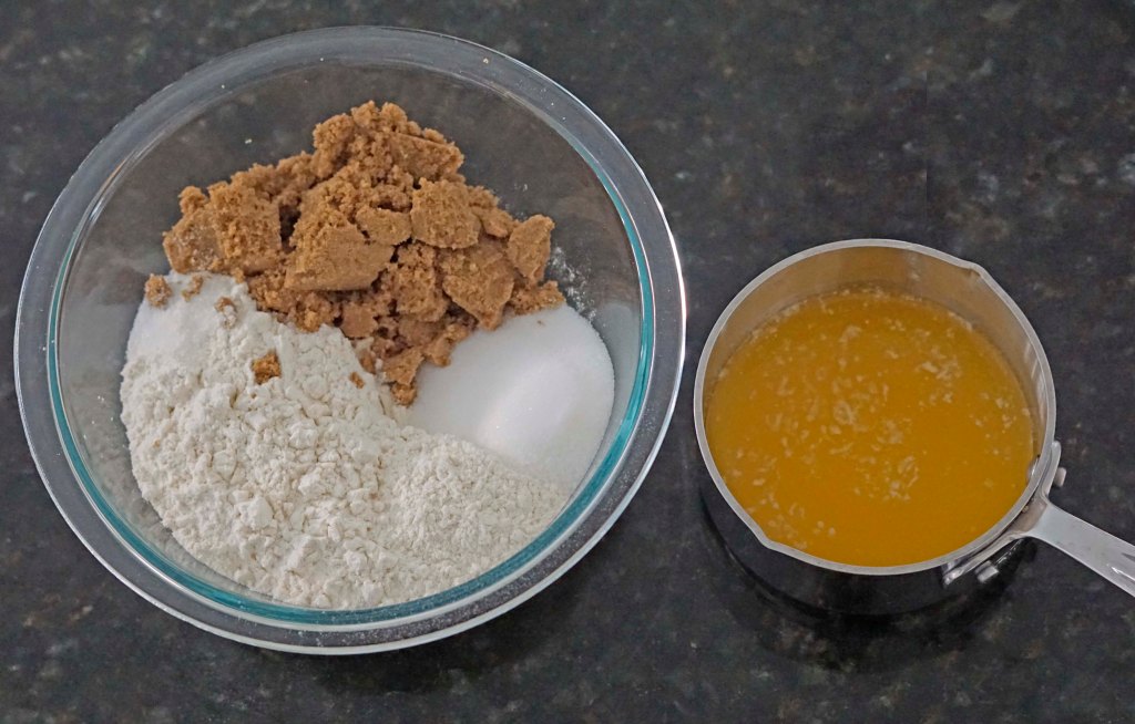 - Make the crumble mixing together the flour, granulated sugar, brown sugar and salt then add the melted butter to the mixture and stir with a fork until it comes together