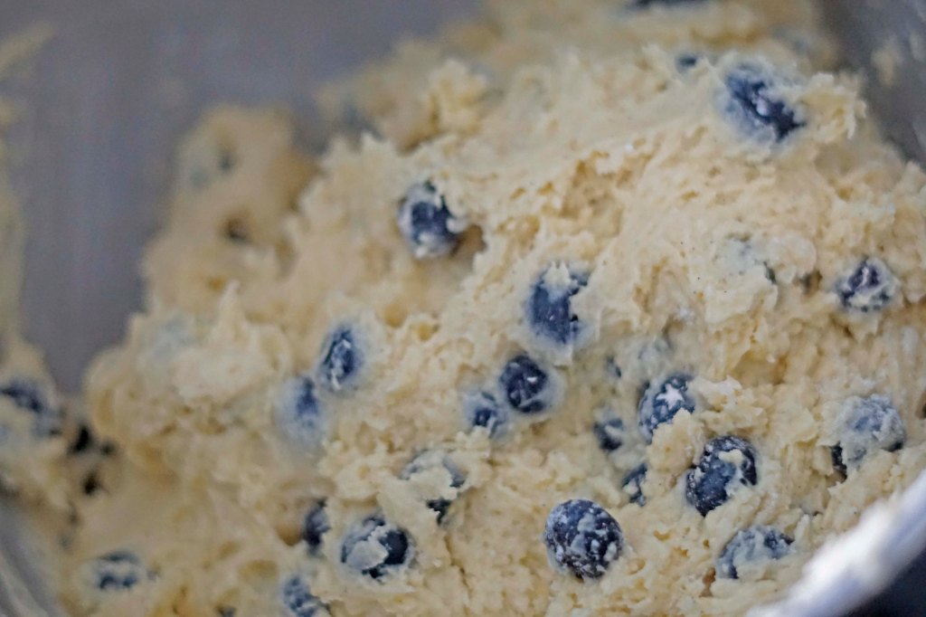 - Take the bowl off the mixer and use a spatula to gently fold the coated blueberries and any extra dry ingredients into the batter.