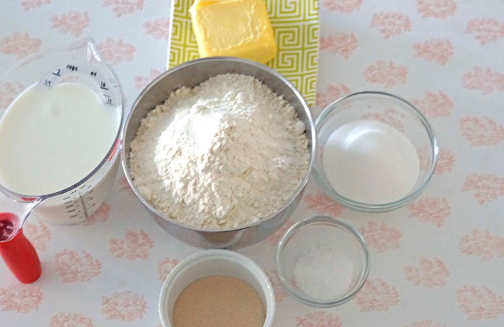 The rest of the ingredients needed to make the dough are 1 1/3 cups of cold whole milk, 5 cups of King Arthur bread flour, 2 teaspoons of salt, 4 tablespoons of granulated sugar, 2 packets of instant yeast (4 1/2 teaspoons) and 8 tablespoons of softened butter (I used salted).