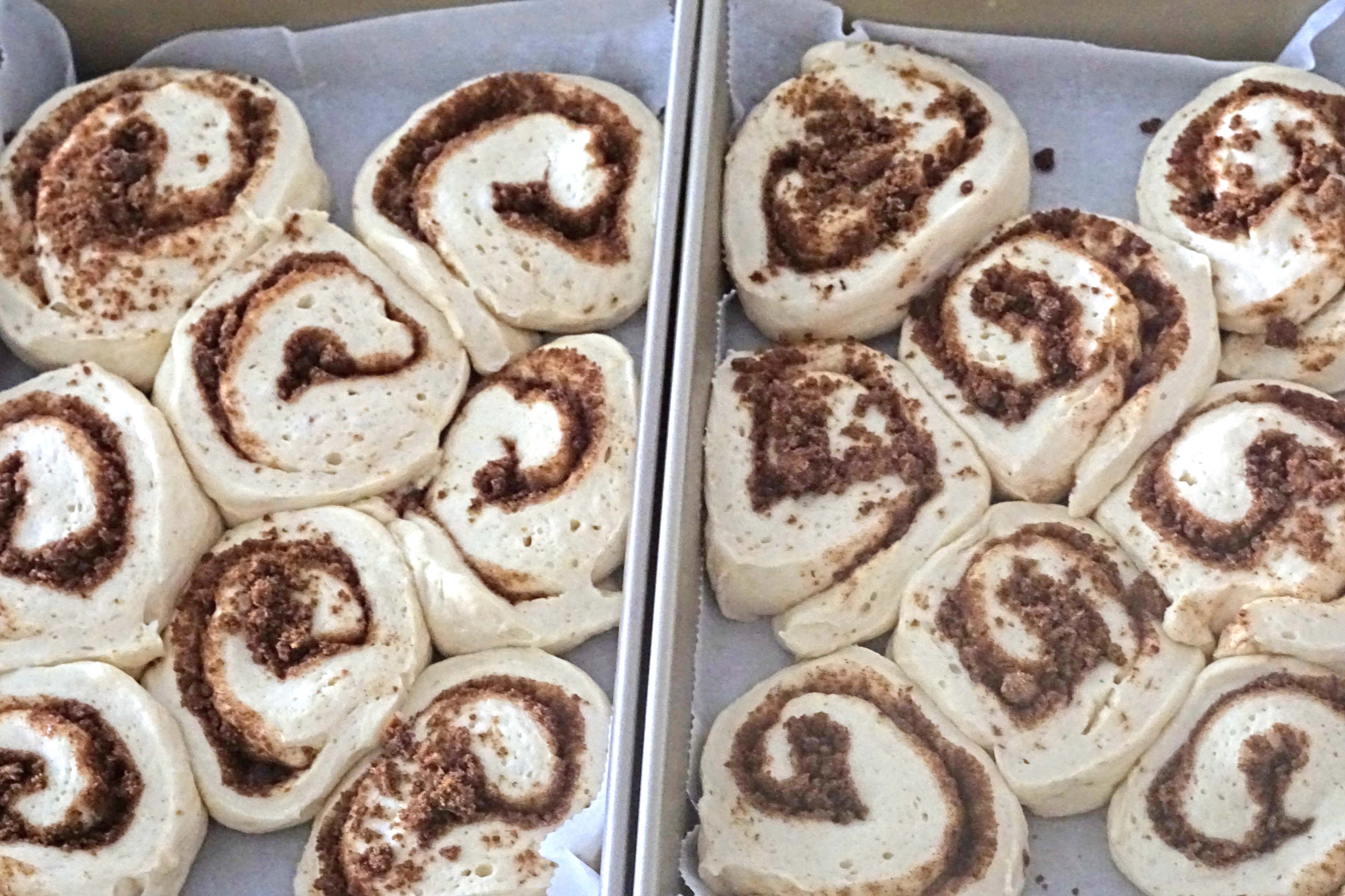 - Roll the dough, starting at the long covered edge. When you get to the bare edge, pull the dough up and pinch it to seal the log. Use unwaxed floss to slice 1 1/2 to 2 inch slices. Place the slices into the baking pans in a 3 on top, 2 in the middle and 3 on the bottom pattern. Cover the pans and let rise again in the warm proofing oven for 30 minutes or on the counter for 60 minutes. You will know they are ready to bake when you can press your finger into the side and the dough does not automatically bounce back.