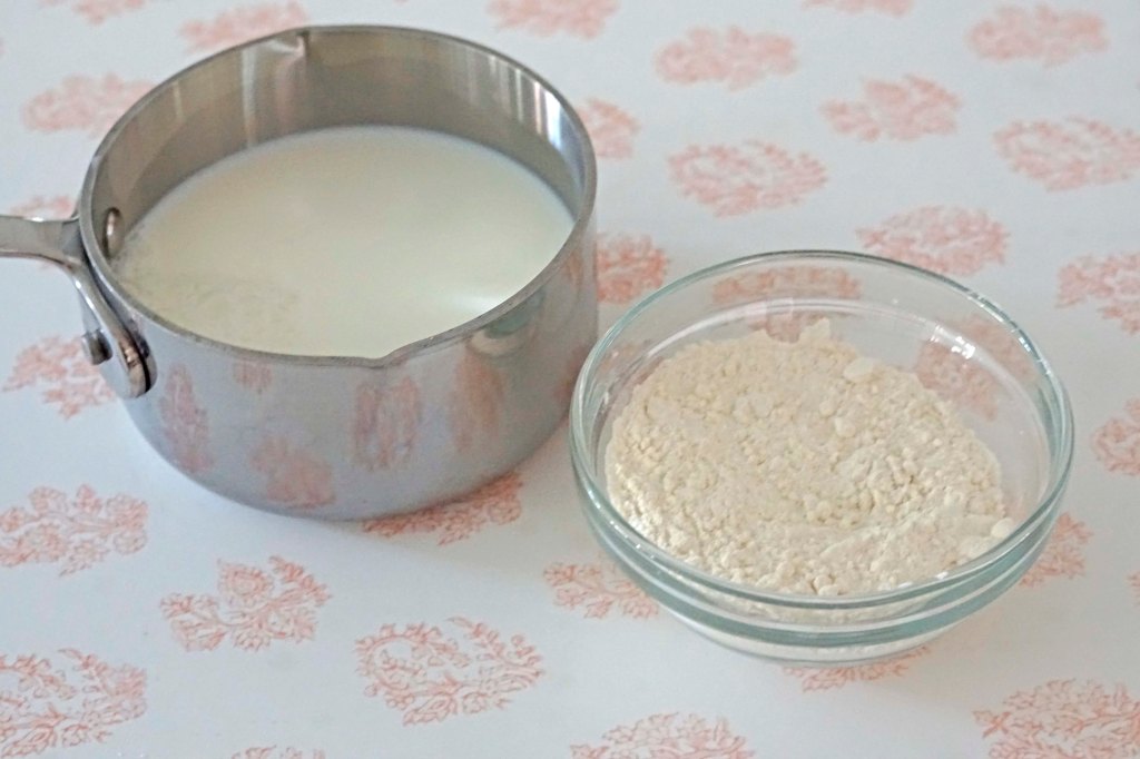 This recipe starts with a tangzhong. A tanzhong is a starter that helps this recipe retain moisture and helps to make the dough so amazingly soft. The ingredients needed are 1 cup of whole milk and 6 tablespoons King Arthur bread flour.