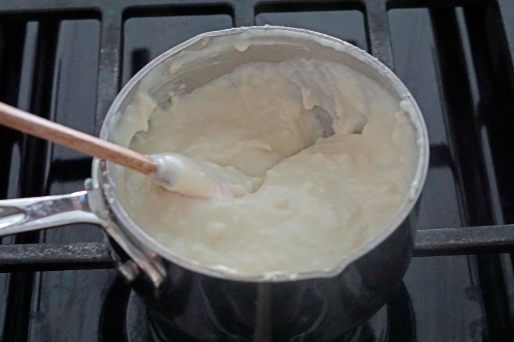 To make the tangzhong, I combined the milk and flour in a small saucepan and whisked them together until there were no more lumps. Then I placed the mixture over medium heat and stirred it until it thickened and my mini spatula showed a line in the pan when I pulled it through the mixture. As soon as it was thickened I put the tangzhong into the bottom of the bowl for my stand mixer.