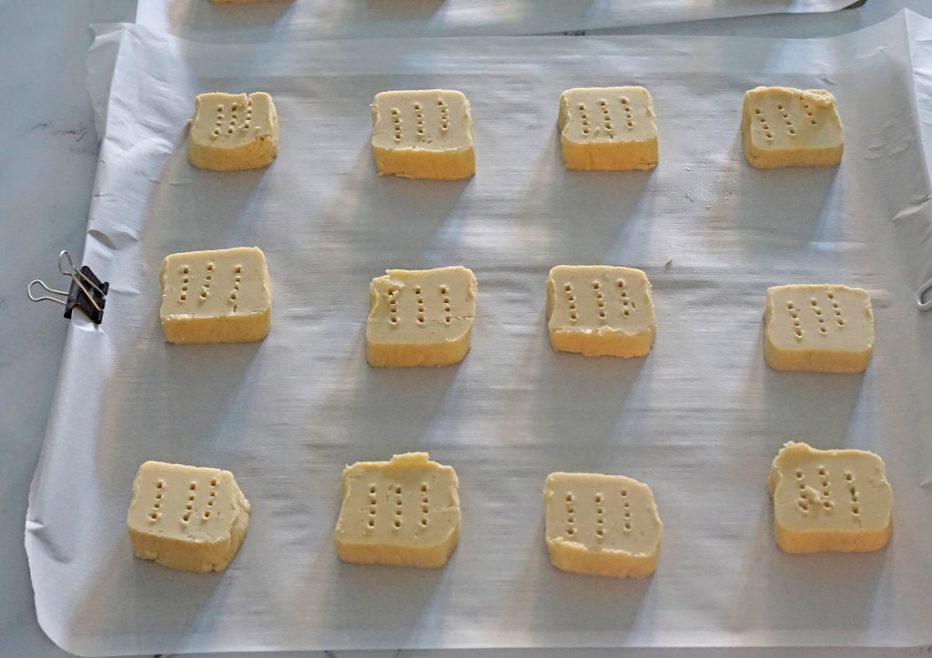 - Remove the dough from the oven and slice into 1/2 inch slices. Spread the cookies out on the baking sheet and use a fork to dock the cookies into the pattern of your choice.