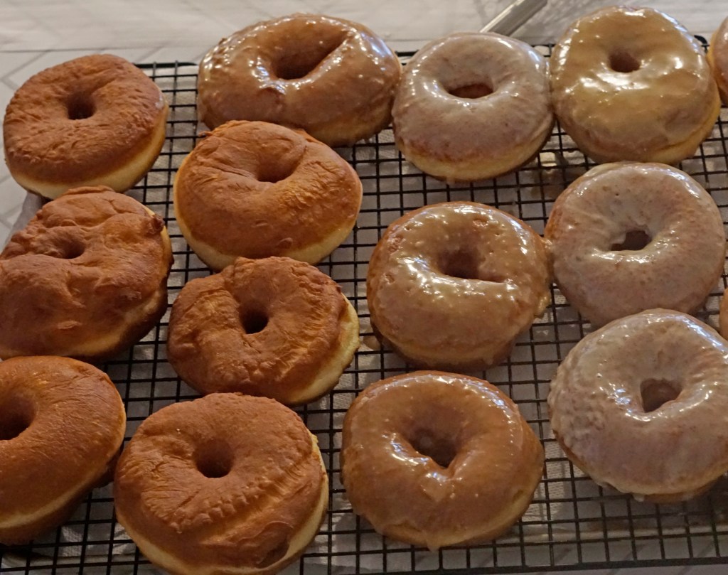 As soon as the doughnuts were finished frying, I used my spider to pull them out of the oil and placed them on the cooling rack. I let each doughnut cool until I could pick them up with my fingers, but they were still warm to the touch. I used my whisk to mix up the glazes again quickly and then I dunked the top of each doughnut into one of the glazes. I did double glaze some of the doughnuts after letting the first round of glaze set up for a few minutes. I allowed the doughnuts to cool completely on the drying rack. I noticed that the maple glaze set up harder than the vanilla bean glaze.