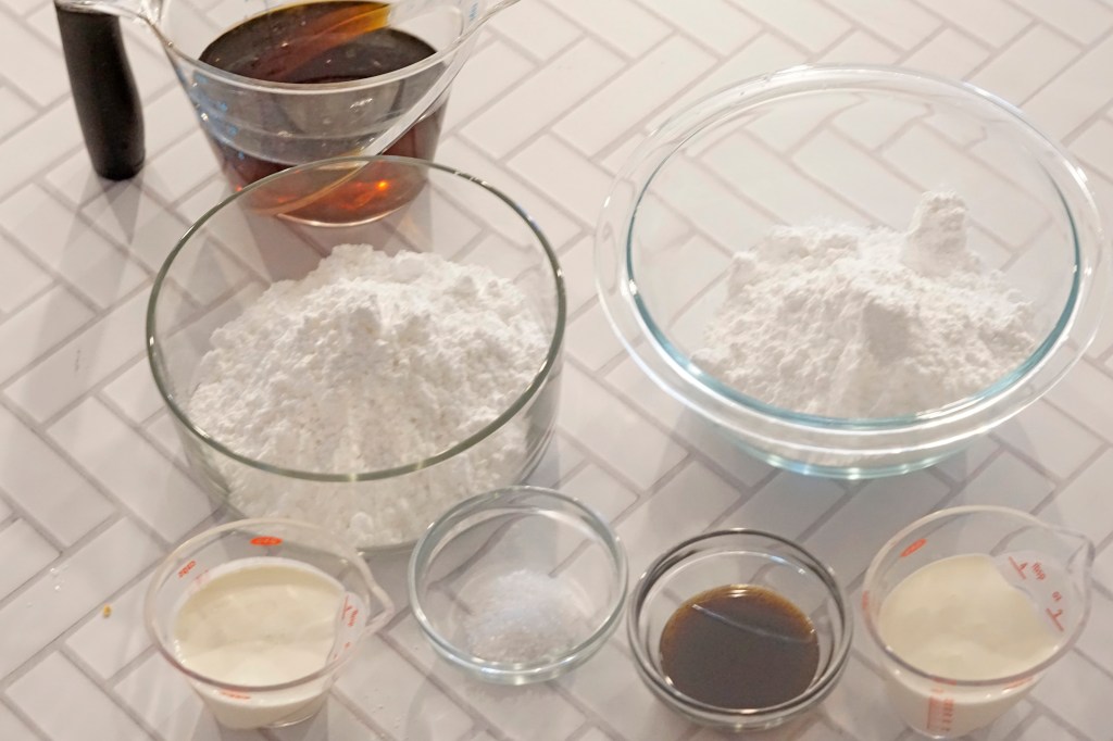 - While the doughnuts proof make the glazes. In a saucepan boil the maple syrup until it reduces in half – 10 + minutes. To make the maple glaze – add the powdered sugar and salt to a bowl and add the reduced maple and whisk until smooth, add the milk as needed to reach your desired consistency. To make the vanilla bean glaze – add the powdered sugar and salt to a bowl and add the vanilla bean paste and milk a little at a time. Whisk until smooth. Add milk until you reach your desired consistency. In a bowl or paper bag, add the cinnamon and sugar and mix.