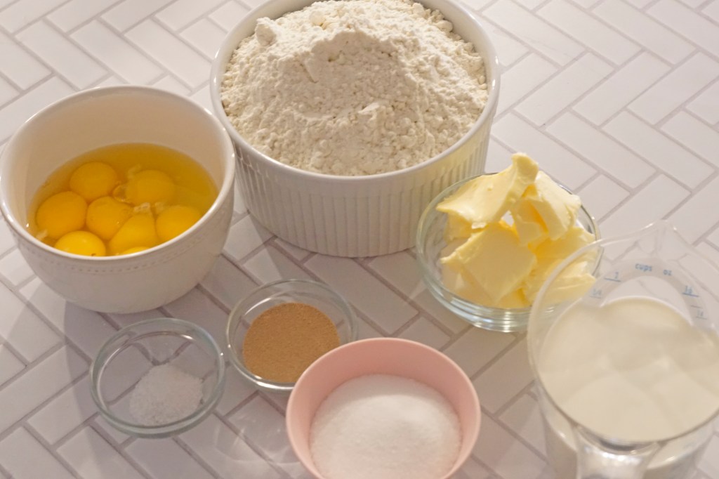 - In the bowl of a stand mixer fitted with a dough hook, mix the flour, salt and sugar, mix to combine. While the mixer is running, add the milk mixture and then the eggs, one at a time. Mix well between each egg. Let the mixer run for about 3 minutes to bring all the ingredients together. You should have a workable dough, if not add a little flour at a time (I needed 3 tablespoons more).