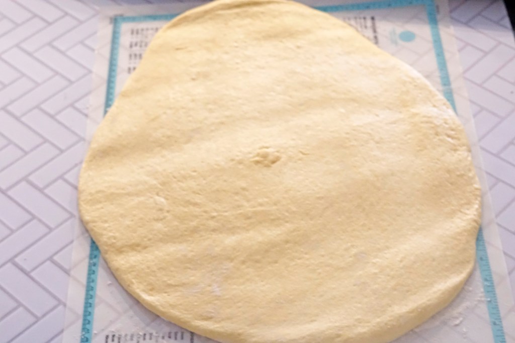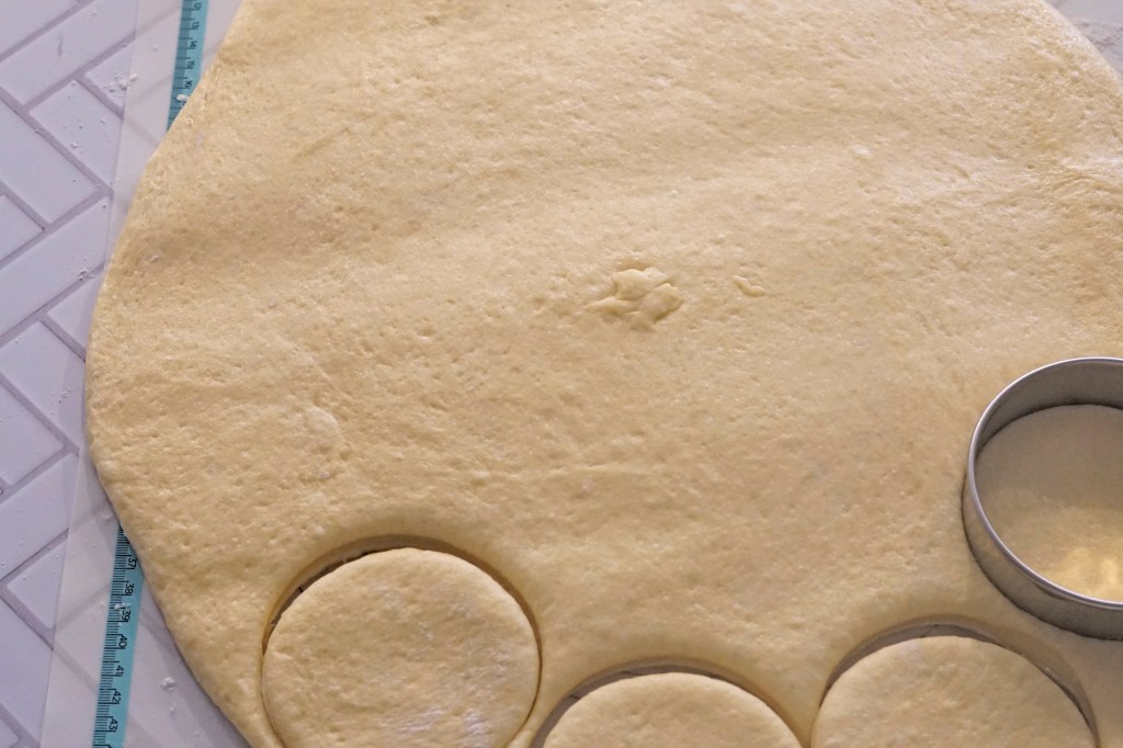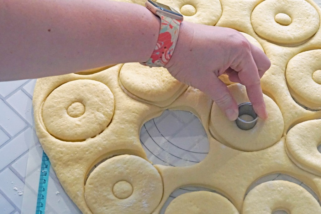 - Dump the dough out onto a floured baking mat and roll the dough to 1/2 inch thickness. Use a 4 inch round cutter to cut out doughnuts. Use a 1 inch round cutter to cut out the doughnut holes from the middle of the 4 inch circles. Place the doughnuts and holes onto the prepared baking sheets.