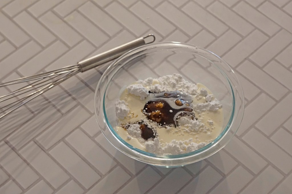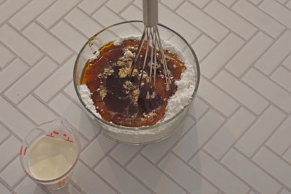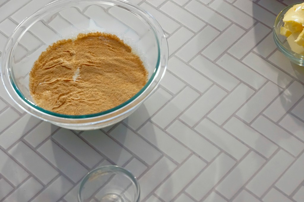 To begin making the dough, the yeast needs to be activated. I heated my milk to 110-115 F degrees. Everyone always says just until warm to the touch, but I’ve overheated it and killed my yeast too many times to count so I always uses my thermometer to double check before I sprinkle in the yeast and a large pinch of sugar. I sprinkled it over the top and then used a whisk to briefly mix it all together. I let it sit for 5 minutes to make sure that the yeast would begin to bubble and activate.