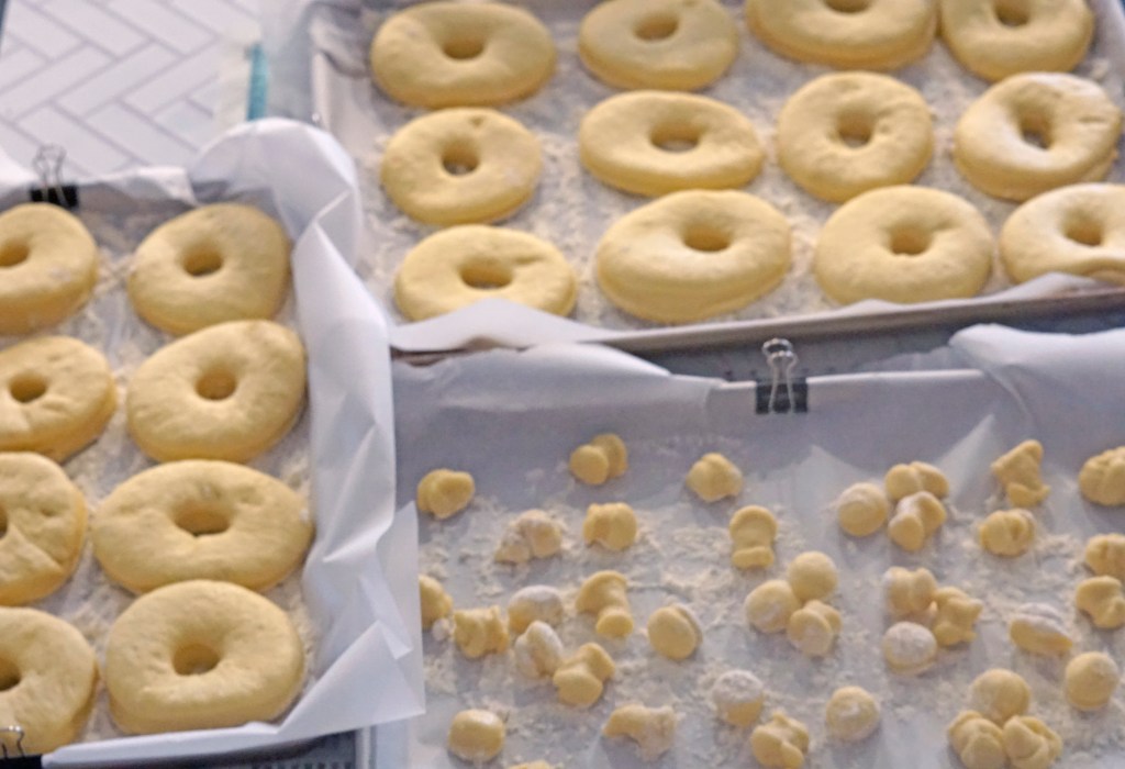 - Gather the scraps and re-roll them and cut out as many doughnuts and holes as possible.