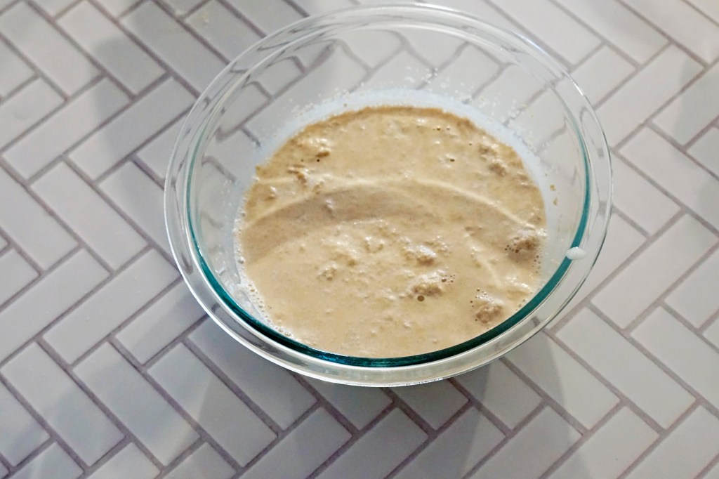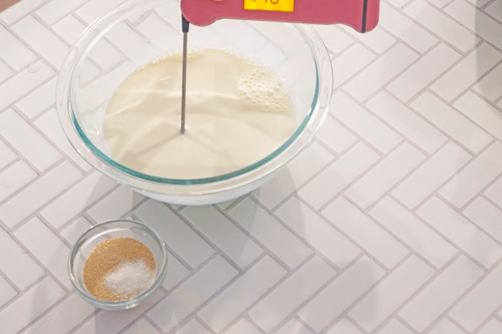 - Heat the milk in a small sauce pan until it reaches 110-115 F degrees. Transfer it to a medium bowl and stir in the yeast and a pinch of sugar. Let it sit until it bubbles – about 5 minutes.